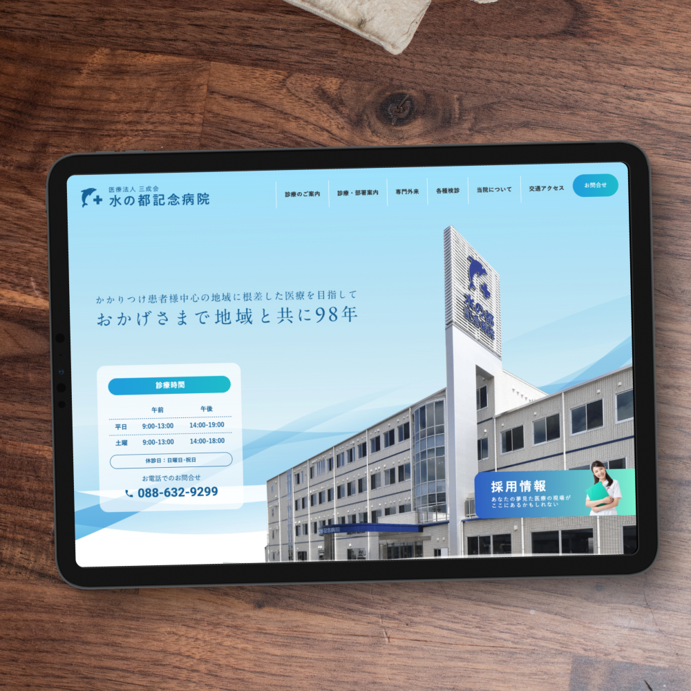 AND制作実績 これまでANDでお手伝いさせていただいたお仕事の実績をご紹介! 水の都記念病院様 ホームページリニューアル HPリニューアル URL:https://www.mizunomiyako.net/